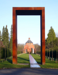 Søndre Kapel set gennem en portal på Vestre Kirkegård