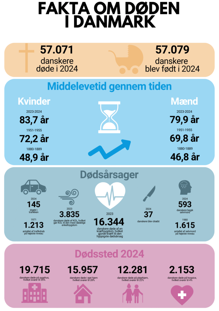 Hvor mange dør årligt, hvor gamle bliver vi - og hvad dør vi af? Her kan du få nøgletal på døden i Danmark fra de seneste år.