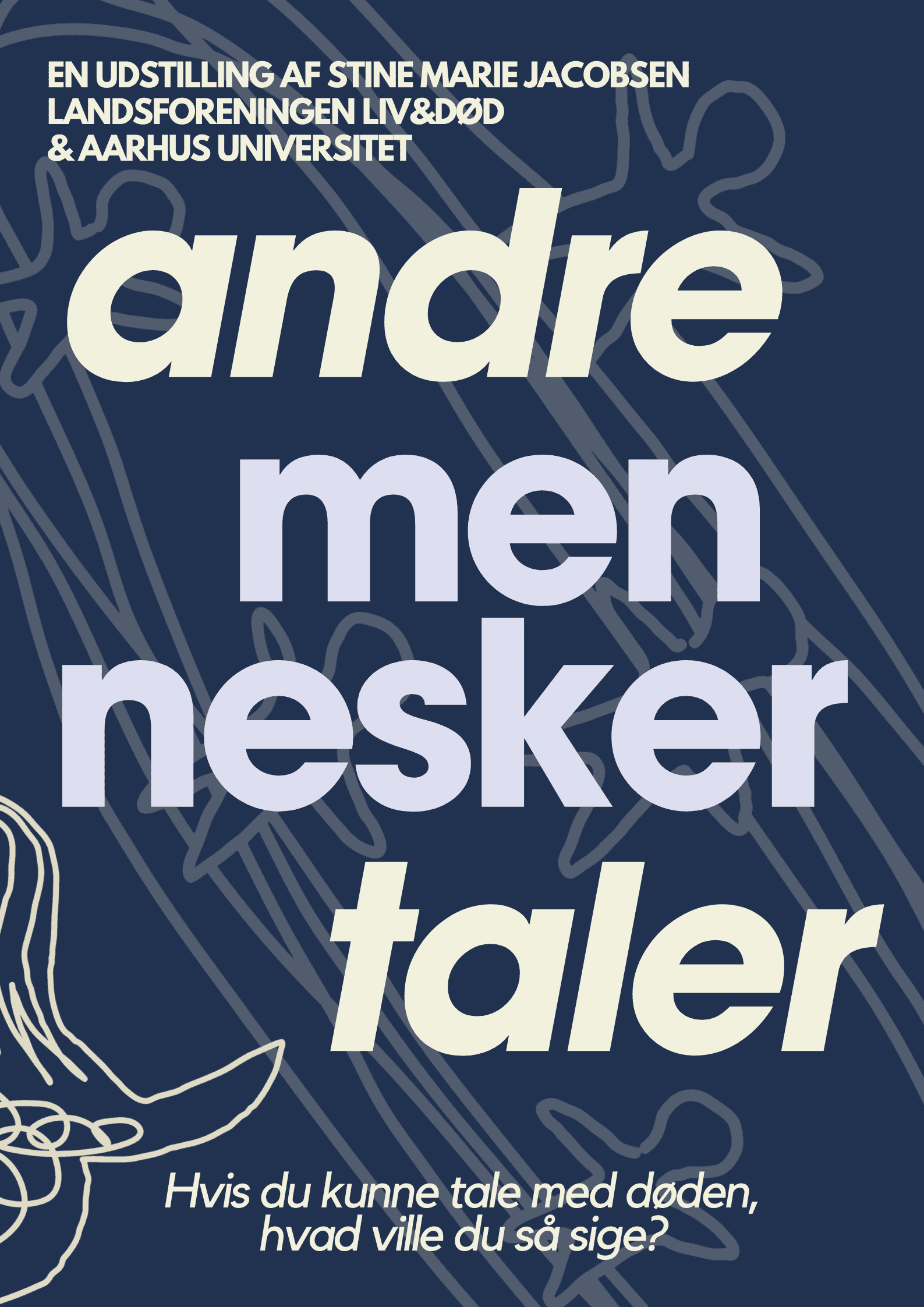 ANDRE MENNESKER TALER er en ny installation skabt af kunstner Stine Marie Jacobsen i samarbejde med Landsforeningen Liv&Død og Aarhus Universitet. Den kan opleves på DOKK1 i Aarhus fra d. 28. oktober til d. 28. november 2025 og er en del af universitetets store undersøgelse af afmagt i Danmark i 2025.
